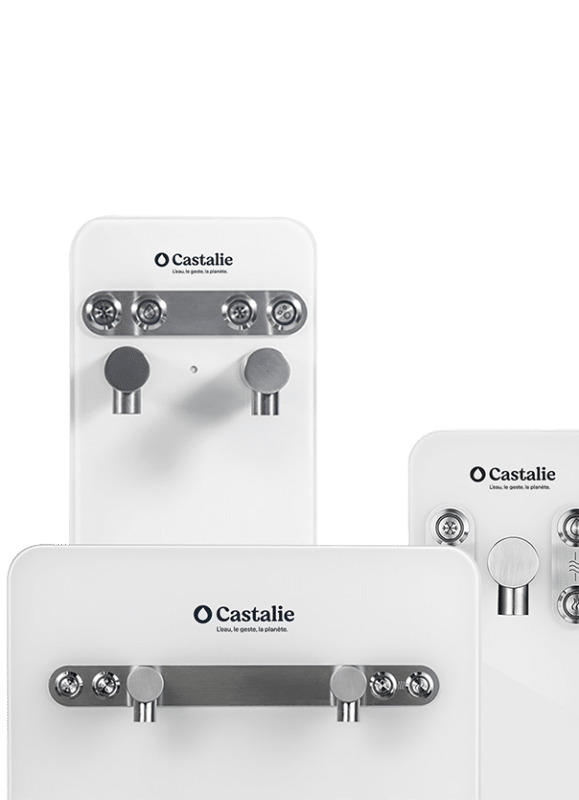 For our hot water equipment, CASTALIE a filter (5µ filtration) with ion exchange resin which, in addition to its activated carbon filter, reduces the hardness of the water (calcium and magnesium ion content) and thus protects the heating element from limescale. This is the same type of filter used in coffee machines. This filtration is only used for hot water distribution.